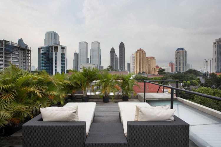 Teras di atap rumah yang dilengkapi sofa panjang dan meja kecil menampilkan pemandangan tak terbatas dari dinamisasi hutan beton yang memukau. Semilir angin menjadikannya tempat menyegarkan diri setelah lelah bekerja seharian dan mencari inspirasi untuk ide-ide cemerlang berikutnya.