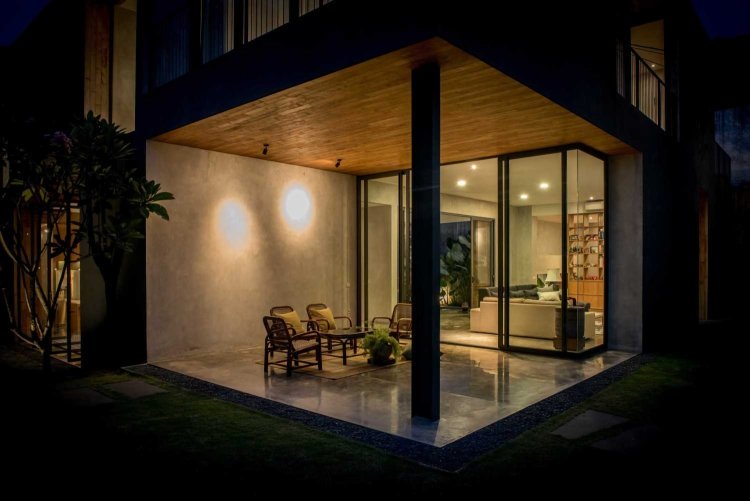 Bukaannya yang relatif besar dan jumlahnya banyak tidak hanya berfungsi untuk pencahayaan dan sirkulasi udara, tetapi juga dimaksudkan untuk menciptakan hubungan yang erat antara rumah dengan lingkungan sekitarnya, serta menghilangkan pembatasnya. Hal ini sudah tampak mulai dari desain teras rumah minimalis dengan bahan kayu dan acian semen kasar. Unsur ini menampilkan kesederhanaan dan kenyamanan, integritas serta kejujuran, dan menjadikan teras rumah ini tampil elegan.