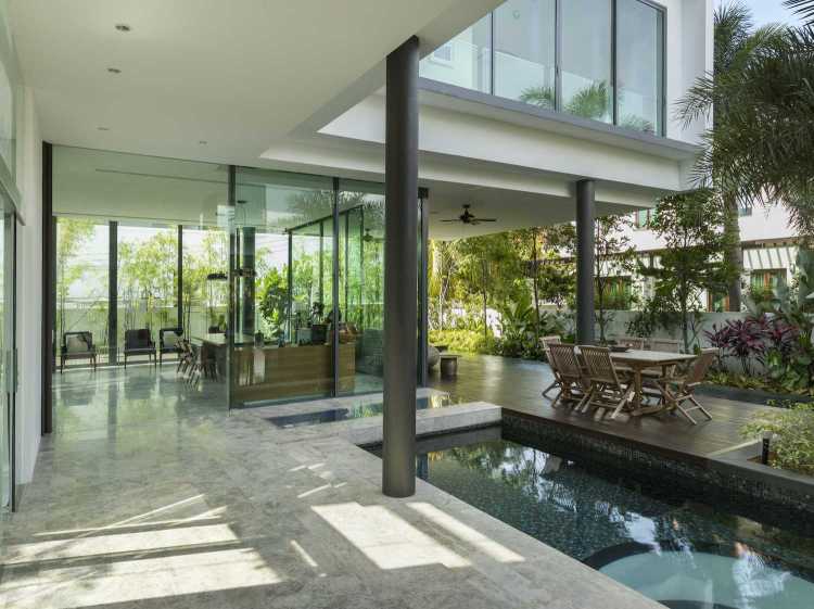 Untuk teras yang lebih pribadi, ruang keluarga dengan bukaan fleksibel menggunakan pintu lipat dari kaca menjadi pilihan desain yang tepat.
