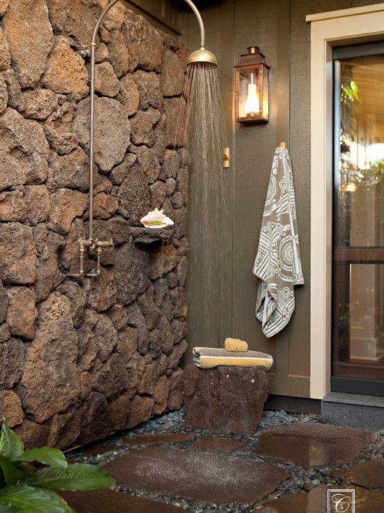 Bosan dengan ruang bilas yang standar ? Cobalah luapkan kreatifitas menggunakan balok kayu atau bebatuan alam. Tambahkan shower dengan ukuran kepala cukup besar supaya aliran air dapat menyebar maksimal. Tentunya perlu ditunjang juga dengan aliran air bersih yang lancar. Ruang bilas seperti ini selain fungsional juga menjadi dekorasi berbuansa alami pada area kolam.