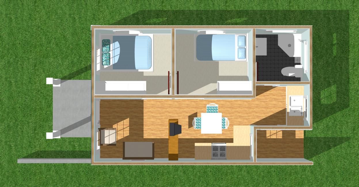 Desain rumah 1 lantai ini cocok diterapkan untuk rumah-rumah mungil, tidak terkecuali untuk rumah minimalis bersubsidi yang umumnya hanya memiliki ukuran di bawah 45 meter persegi. Dua kamar diletakkan bersisian agar memberikan ruang terbuka di sisi lain.