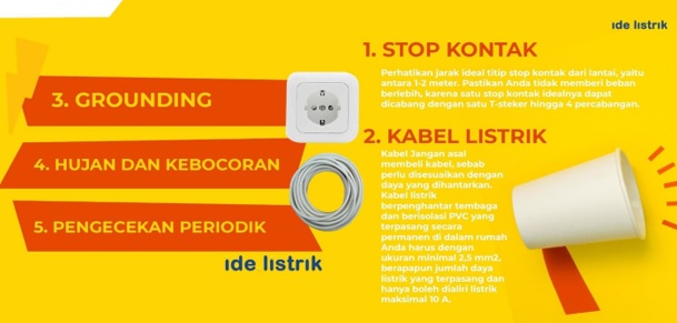 1. Stop kontak Perhatikan jarak ideal titip stop kontak dari lantai, yaitu antara 1-2 meter. Pastikan Anda tidak memberi beban berlebih, karena satu stop kontak idealnya dapat dicabang dengan satu T-steker hingga 4 percabangan.