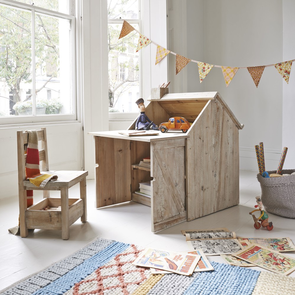Bagaimana dengan sebuah meja kayu dengan bentuk yang menyerupai sebuah rumah? Berikan sentuhan rustic pada area belajar si kecil dengan satu set meja belajar dan kursi dari material kayu yang sengaja didesain dengan bentuk yang tidak biasa ini. Meja belajar anak ini dilengkapi juga dengan area penyimpanan untuk memastikan semuanya peralatan belajar anak tersimpan dengan rapi.