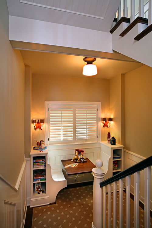 Sudut ruangan yang tidak terpakai ternyata dapat dimanfaatkan untuk menempatkan sebuah meja belajar yang melengkung seperti ini. Salah satu hal menarik dari desain ini adalah desainnya yang berkembang dan dapat dipergunakan oleh si kecil hingga ia tumbuh dewasa.