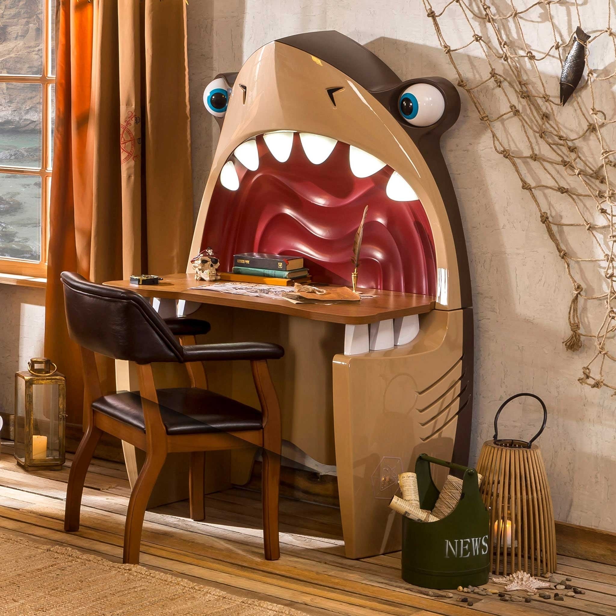 Buat suasana belajar anak menjadi lebih menyenangkan dengan desain meja belajar yang unik seperti yang satu ini. Meja ini didesain menyerupai kepala hiu yang sedang membuka mulutnya. Si kecil pasti betah untuk menggunakan meja ini.