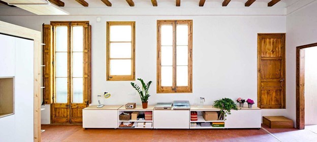 Selain sifatnya yang fungsional, elemen konstruksi bangunan turut berkontribusi pada tampilan hunian. Warna cokelat kayu yang dipilih sebagai bingkai pintu dan jendela, merupakan warna yang sama dengan tiang kayu pada langit-langit ruangan. Warna cokelat kayu gelap ini terlihat menonjolkan urat dan pola kayu yang membuatnya terlihat keren. Pada saat yang bersamaan, memberikan kesan hangat pada seluruh ruangan.